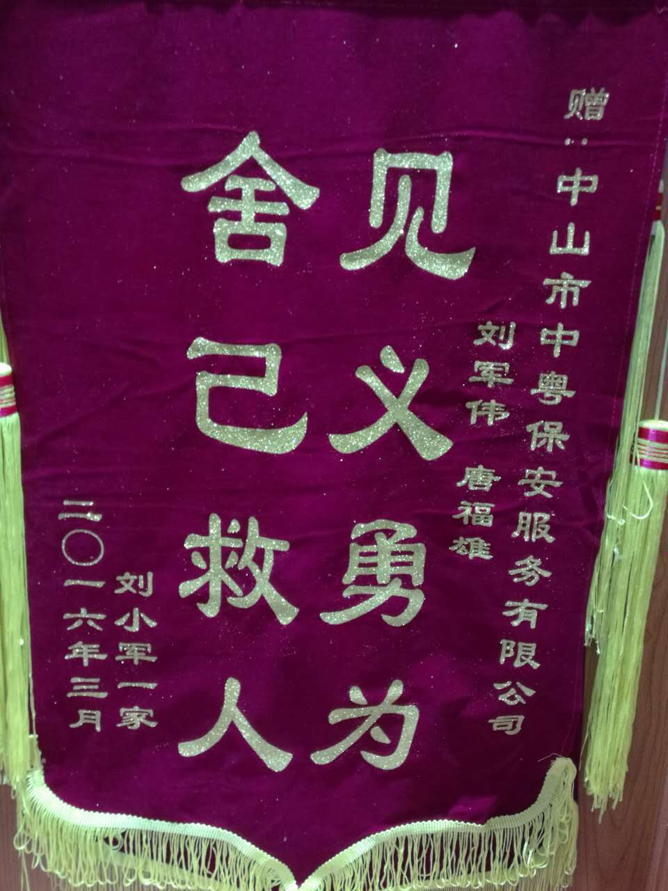 2016年3月,劉小軍一家贈中山市中粵保安服務有限公司劉軍偉、唐福雄“見義勇為 舍己救人”錦旗。
